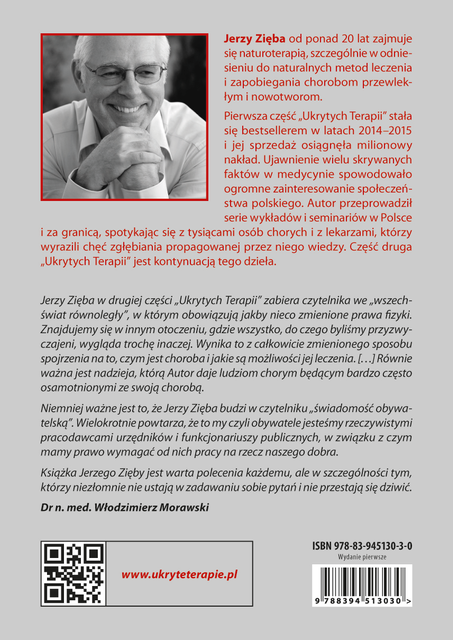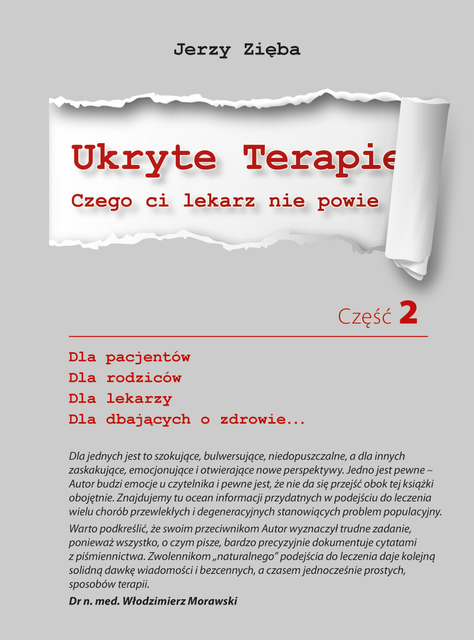 Dla jednych jest to szokujące, bulwersujące, niedopuszczalne, a dla innych zaskakujące, emocjonujące i otwierające nowe perspektywy. Jedno jest pewne – Autor budzi emocje u czytelnika i pewne jest, że nie da się przejść obok tej książki obojętnie. Znajdujemy tu ocean informacji przydatnych w podejściu do leczenia wielu chorób przewlekłych i degeneracyjnych stanowiących problem populacyjny. Warto podkreślić, że swoim przeciwnikom Autor wyznaczył trudne zadanie, ponieważ wszystko, o czym pisze, bardzo precyzyjnie dokumentuje cytatami z piśmiennictwa. Zwolennikom „naturalnego” podejścia do leczenia daje kolejną solidną dawkę wiadomości i bezcennych, a czasem jednocześnie prostych, sposobów terapii. Jerzy Zięba w drugiej części „Ukrytych Terapii” zabiera czytelnika we „wszechświat równoległy”, w którym obowiązują jakby nieco zmienione prawa fizyki. Znajdujemy się w innym otoczeniu, gdzie wszystko, do czego byliśmy przyzwyczajeni, wygląda trochę inaczej. Wynika to z całkowicie zmienionego sposobu spojrzenia na to, czym jest choroba i jakie są możliwości jej leczenia. […] Równie ważna jest nadzieja, którą Autor daje ludziom chorym będącym bardzo często osamotnionymi ze swoją chorobą. Niemniej ważne jest to, że Jerzy Zięba budzi w czytelniku „świadomość obywatelską”. Wielokrotnie powtarza, że to my czyli obywatele jesteśmy rzeczywistymi pracodawcami urzędników i funkcjonariuszy publicznych, w związku z czym mamy prawo wymagać od nich pracy na rzecz naszego dobra. Książka Jerzego Zięby jest warta polecenia każdemu, ale w szczególności tym, którzy niezłomnie nie ustają w zadawaniu sobie pytań i nie przestają się dziwić.