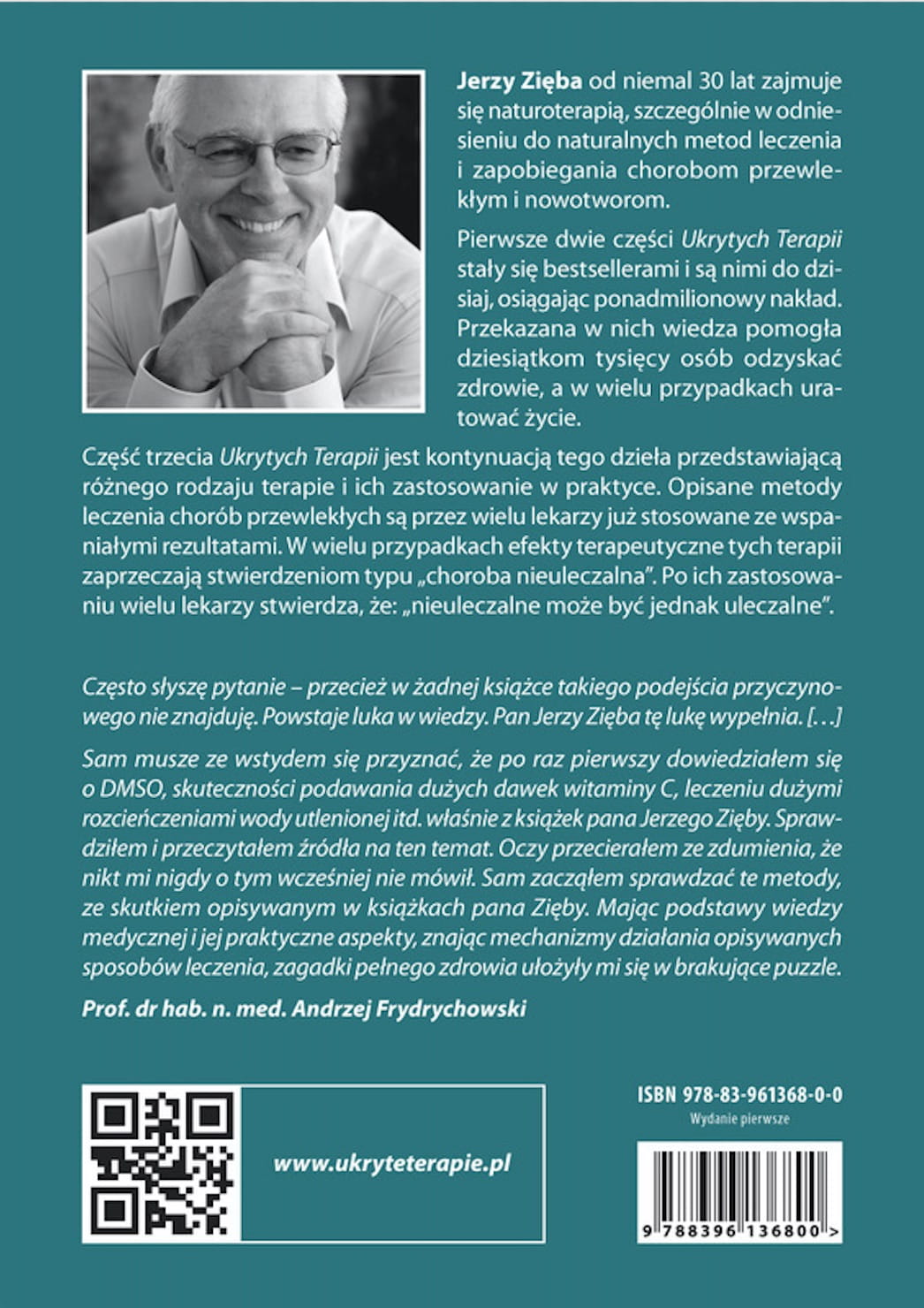 Na dwóch pierwszych latach uczymy studentów medycyny podstaw funkcjonowania organizmu: anatomii, fizjologii, biochemii, biofizyki itd. Dajemy im podstawy rozumowania lekarskiego. A potem diabli wszystko biorą. W następnych latach studiów przechodzimy do uczenia algorytmów leczenia poszczególnych chorób czy narządów. Powstają specjalizacje zajmujące się tylko jednym narządem. Mamy wybitnych specjalistów tylko od kolana, nerki czy kanalika łzowego. A co z tłem powstawania tych zmian. Ani słowa. Wniosek prosty, coś z systemem nauczania jest nie tak. Uczymy studentów postępowania w chorobach ostrych i to jest niezwykle potrzebne i skuteczne. Natomiast nie uczymy postepowania w chorobach przewlekłych. Mądry lekarz, powinien dostrzec, że coś tu jest nie tak. Powinien sam poszukiwać rozwiązań. Czasami próbuje to robić i w zamian …obrywa. Jest wzywany i karany przez Izbę Lekarską, traci stanowisko. Wielu kolegów to widzi i odpuszcza. System represji jest skuteczny. Często słyszę pytanie, przecież w żadnej książce takiego podejścia przyczynowego nie znajduję. Powstaje luka w wiedzy. Pan Jerzy Zięba tę lukę wypełnia. Wskazuje jakimi drogami należy podążać ażeby pomagać chorym z chorobami przewlekłymi, a co najważniejsze nie są to jego koncepcje i wymysły. Jest to wiedza oparta na przeczytaniu, ze zrozumieniem, setek i więcej publikacji naukowych, oraz rozmów z lekarzami ją stosującymi. Podaje obszerną bibliografię artykułów zamieszczonych w naukowych i recenzowanych czasopismach, na podstawie której o tych metodach pisze. To nie są poglądy pana Zięby, to jest jego mrówcza praca przeczytania wielu źródeł zawartych w publikacjach naukowych i przeanalizowanie wielu faktów, na końcu podaje nam tę wiedzę na tacy. Sam musze ze wstydem się przyznać, że po raz pierwszy dowiedziałem się o DMSO, skuteczności podawania dużych dawek Wit C, leczeniu dużymi rozcieńczeniami wody utlenionej itd. właśnie z książek pana Jerzego Zięby. Sprawdziłem i przeczytałem źródła na ten temat. Oczy przecierałem ze zdumienia, że nikt mi nigdy o tym wcześniej nie mówił. Sam zacząłem sprawdzać te metody, ze skutkiem opisywanym w książkach pana Zięby. Mając podstawy wiedzy medycznej i jej praktyczne aspekty, znając mechanizmy działania opisywanych sposobów leczenia, zagadki pełnego zdrowia ułożyły mi się w brakujące puzzle. Powinienem może więcej napisać na ten temat, jest to książka pana Zięby i on o tym pisze. Zwrócę tylko uwagę na jeden związek chemicny, to jest DMSO. To z jego książek się o nim dowiedziałem, to dzięki niemu zwróciłem uwagę na coś tak wspaniałego, a tak niedocenianego i jednocześnie tak opluwanego przez moich kolegów. Proszę ich o zapoznanie się z nim, a potem wyrażanie negatywnych opinii. Literatury na ten temat (oczywiście naukowej) jest bardzo dużo. Sam posiadam ponad 100 publikacji o niezwykłej skuteczności i niezwykłych właściwości tego związku.